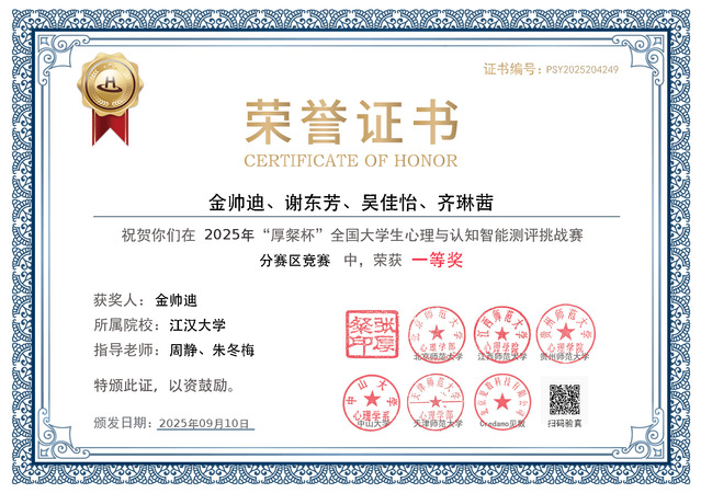 2025 9 27 日,由全国大学生心理测量赛事联盟主办、北京师范大学等单位承办的首届 “厚粲杯” 全国大学生心理与认知智能测评挑战赛圆满落幕。经过校赛、区域赛和全国总决赛的层层选拔与激烈角逐,由江汉大学教育学院应用心理学专业 21 级金帅迪(队长)、21 级谢东芳、22 级齐琳茜和 23 级吴佳怡四位同学组成,朱冬梅和周静老师共同指导的 “行藏・π 队”,凭借创新作品《朝夕乐苦,解以烟雨平生:基于 NLP 的苏轼人格量表开发》,从全国 1600 余支参赛队伍中脱颖而出,最终荣获全国二等奖的佳绩。
