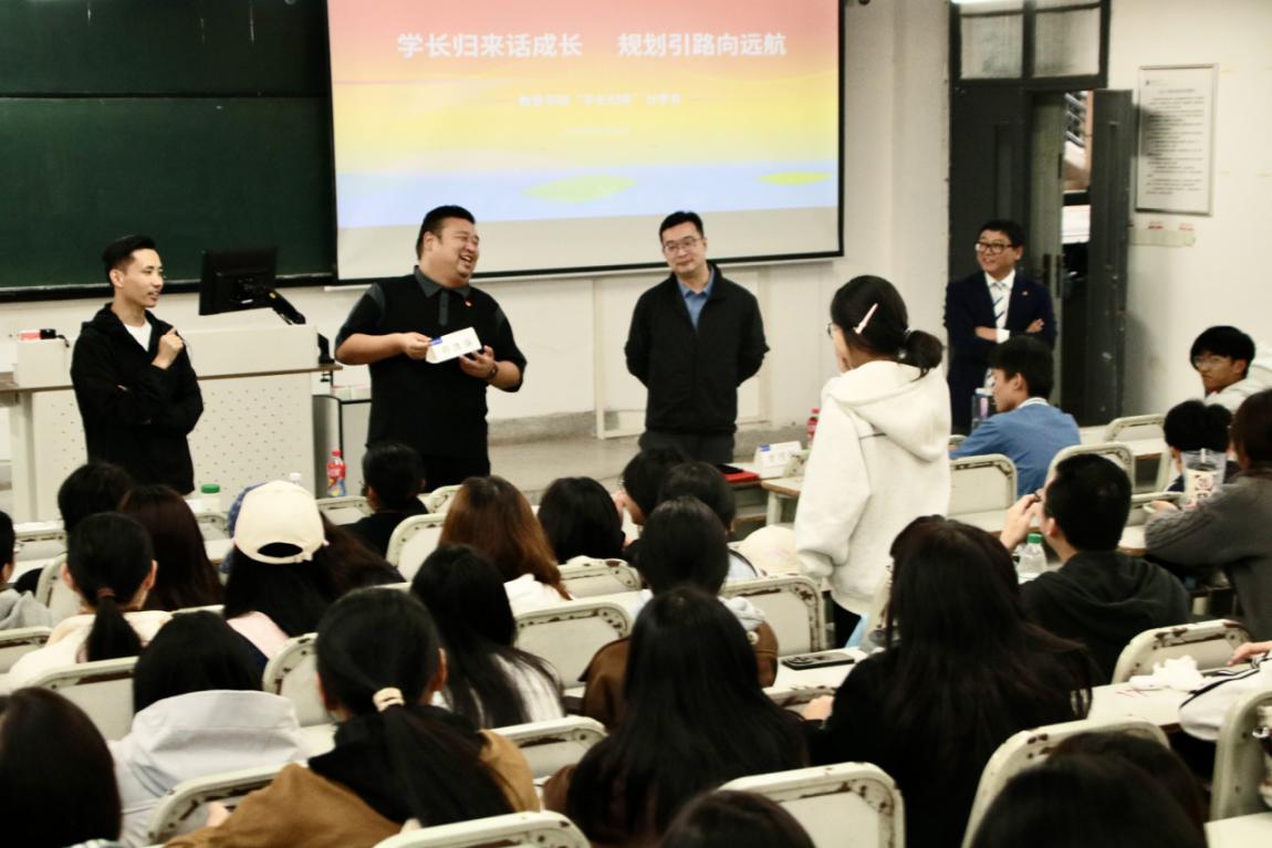 “学长归来”分享会现场,方河俊、邵胜强、赵千、万敬兵四位优秀校友以“成长导师” 身份传经送宝,助力在校学子明确成长方向、做好学业与职业规划。