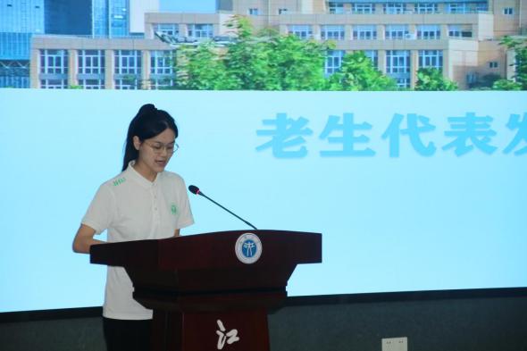 班主任代表韦怡彤提醒新生们要尽快转变学习思维,从“被动接受知识”转向“主动探索学习”,遇到困难及时向老师、学长求助。她还强调了班级凝聚力的重要性,鼓励新生们互帮互助、共同进步。老生代表何真珍作为“过来人”,从学习方法、时间管理、社团选择三个方面向新生分享了实用的经验与心得。新生代表夏诗琪代表全体新生表达了对大学生活的憧憬与期待,并表示将以勤奋学习、积极进取的态度和实际行动回应学院、老师与家长的信任与期待。