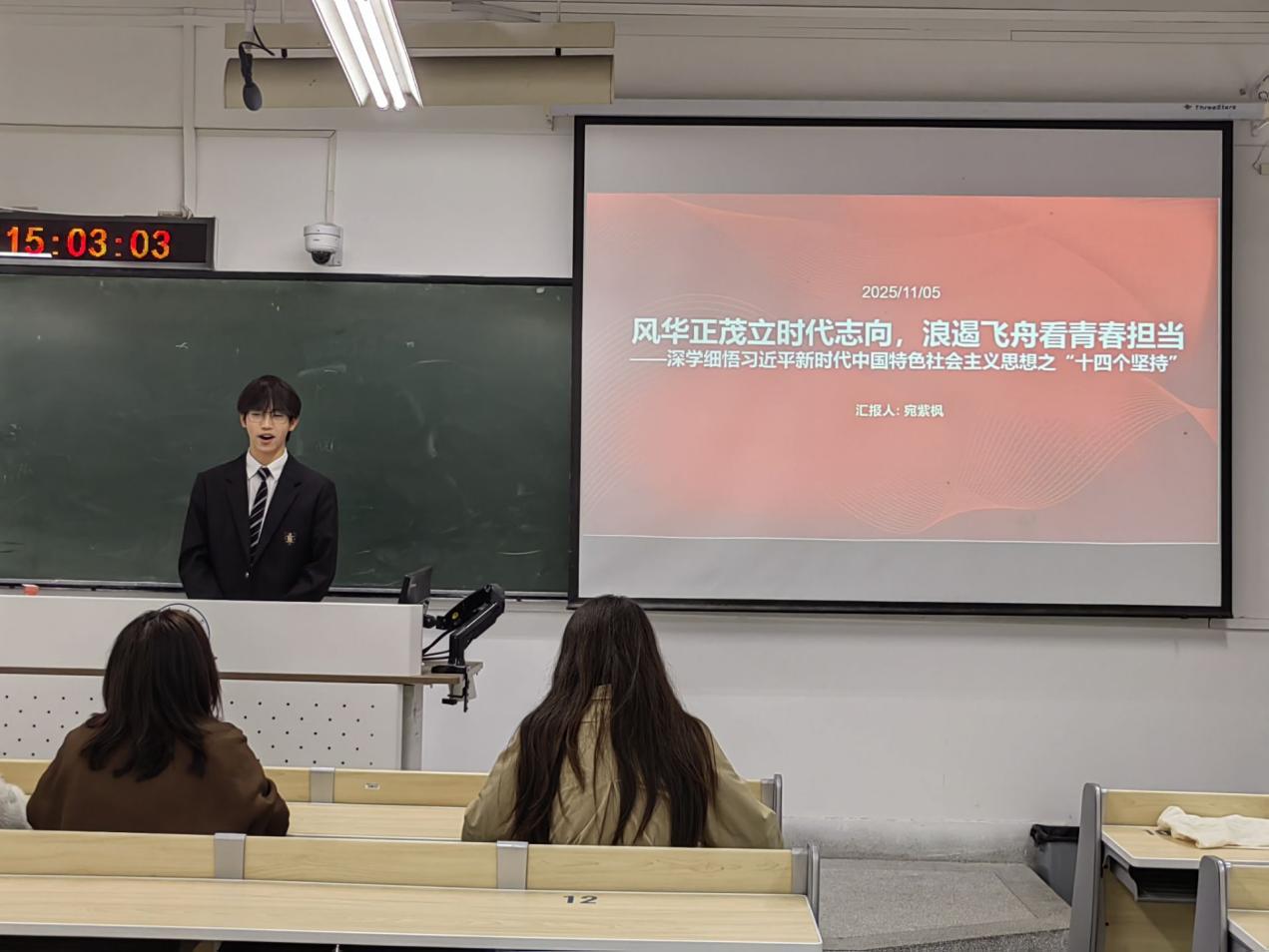 宛紫枫选手结合自身对习近平新时代中国特色社会主义思想的深学细悟,以青年人的热情与真挚,分享了新时代青年践行“十四个坚持”的实践方向。“持长剑纵马,执妙笔生花。”他向当代青年发出倡议:正值风华正茂之年,当怀浪遏飞舟的豪情,以习近平新时代中国特色社会主义思想为根本指引,在青春的赛道上奋力奔跑,绘就属于新时代青年的人生壮丽画卷。
