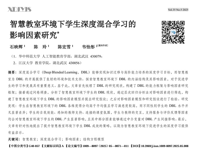 近日,我院韦怡彤博士作为通讯作者,与校外科研团队合作完成的研究成果《智慧教室环境下学生深度混合学习的影响因素研究》,在我国教育技术领域重要期刊《现代教育技术》2025年第5期正式发表。该研究开创性地构建了智慧教室环境中学生深度混合学习的影响因素模型,为智能化环境下推动教学改革、提升学生学习质量提供了重要的理论支撑与实践路径。