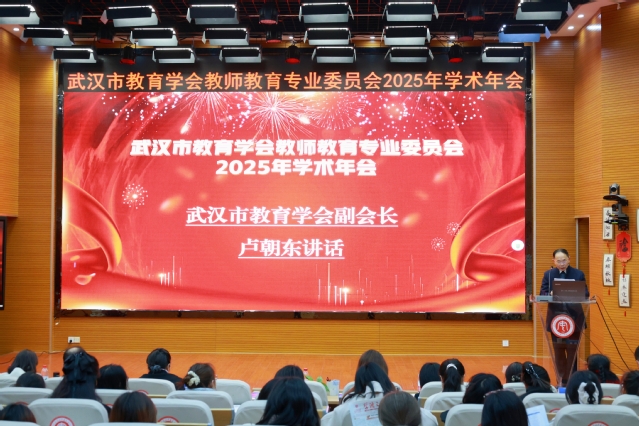 随后,武汉市教育学会副会长卢朝东作重要讲话。他从理论、政策和实践层面,深入分析了教育发展前沿趋势与核心任务,强调要利用技术解放教师生产力,实现个性化教学,创新评价方式。同时他强调要保持教育定力,关注学生全面发展、核心素养培育和师生关系建构,规避技术依赖与伦理风险。他指出,教育家精神蕴含在教师对专业的精益求精、对学生的无私关爱和对教育规律的持续探索之中,希望专委会挖掘宣传先进典型,激发教师内生动力。最后,他表示,教师教育质量关乎武汉教育未来,希望专委会继续发挥桥梁纽带和学术引领作用,凝聚智慧,产出更多成果,为打造高素质、专业化、创新型骨干教师队伍贡献力量。